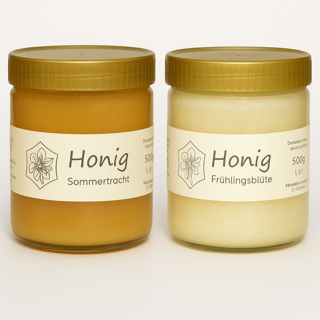 Im Mischkarton erhalten Sie die zwei beliebtesten Honige eines Imkerjahres im 500-g-Glas – einmal Frühlingsblüte, einmal Sommertracht. So schmecken Sie den Wandel der Natur vom ersten sanften Blühen bis zur aromatischen Fülle des Hochsommers.